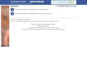Breakup Notifier est une petite application destinée au réseau social Facebook. Elle permet d'être instantanément informé des changements de situation amoureuse de vos contacts grâce à l'envoi d'un email.
