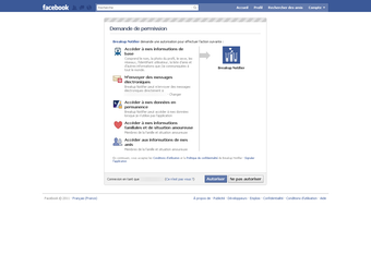 Breakup Notifier se configure en quelques secondes. Rendez-vous sur la page d'accueil de Breakup Notifier afin de vous connecter à votre compte Facebook. Vous devez ensuite autoriser l'application web à accéder aux informations de votre compte.